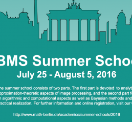 BMS Summer School Mathematical and Numerical Methods in Image Processing Date: 25 July – 05 August 2016 Venue: Berlin Mathematical School (BMS) Website: https://www.math-berlin.de/academics/summer-schools The conference aims at providing a condensed course on current topics in mathematical image processing held by locally as well as internationally renowned scientists in the field. The program will […]